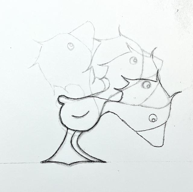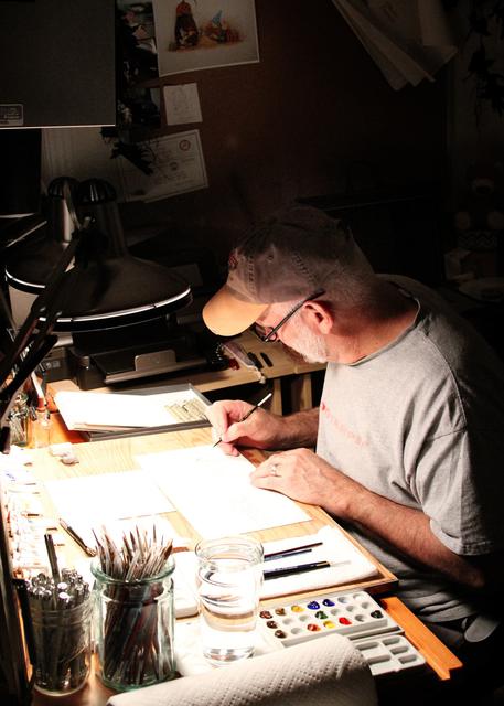 In many ways I work like an animator. I sketch the Key Character on a piece of paper and then trace the character onto vellum or tracing paper making changes to head of body position as needed. This way I can keep the character's proportions consistent throughout a book project.