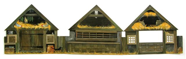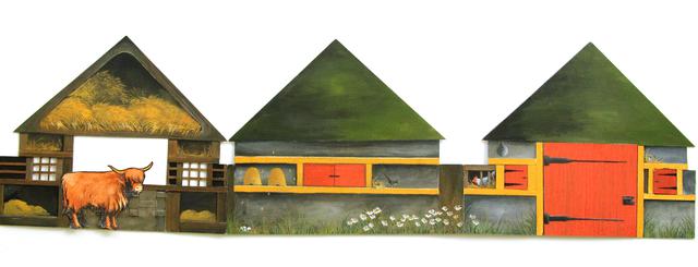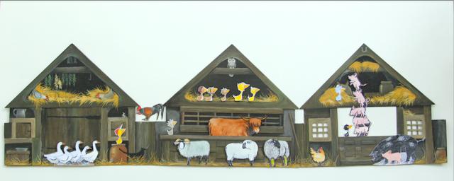 Interior with farm animals. Note how the Highland cow is standing inside one of the woven paper pockets.