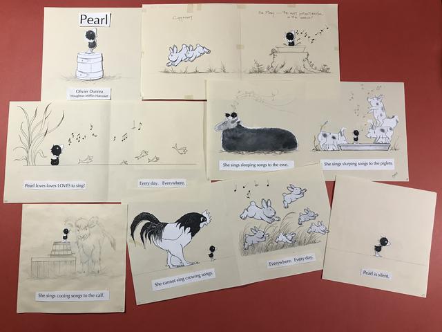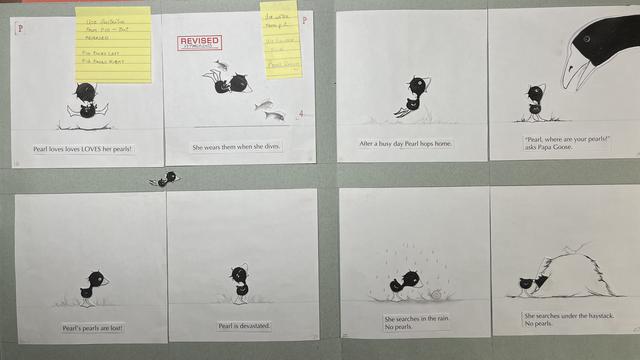 Here are a few of the pages in the dummy for Pearl's Lost Pearls. I like to see the progression of the sequence of events so this method allows me to see eight pages at a time in order to keep track of layouts and story progression.