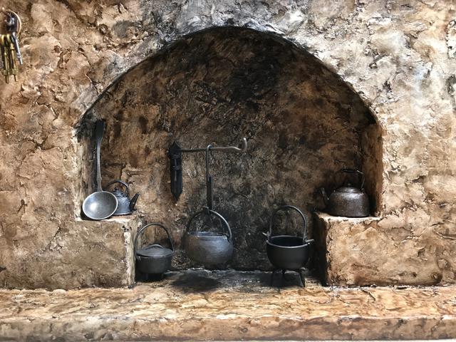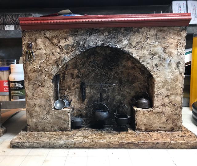 This is the first medieval fireplace that I made. The fireplace has a sturdy cardboard foundation over which the DAS is applied roughly to simulate rough stone. After painting the fireplace I added the miniature pewter accessories (most I had bought many years ago from the Franklin Mint). I found the miniature fireplace crane on Etsy. I blackened the rear wall of the fireplace so that it looks like the fireplace has been used for cooking/heating.