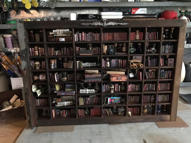 This is the same room box but now the furnishings have been change. I made the bookcase from a vintage type drawer---it already had the aged vintage patina I wanted for the bookcase that might be found in a vampyres castle or manor house. I made all the miniature scrolls, maps, documents, books etc. You will see how the library idea became more expanded over the years.